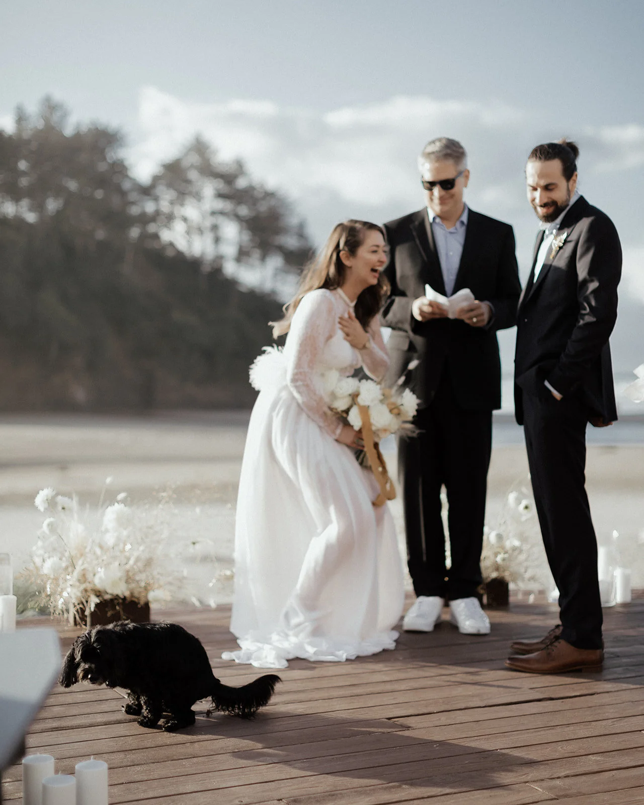 Their wedding day began with the two of them rushing to nearby Tillamook to obtain their marriage certificate as soon as the courthouse opened! Once they returned back to their family, they all shared a brunch together, followed by a leisurely stroll on the beach with their pups! (Yes, they also flew their 3 dogs to have them as a part of the festivities!) They began to separately get ready, with mimosas & joints in hand, and then shared a private First Look together. Following their first look, Rachel also chose to share a First Look moment with her dad & brother.